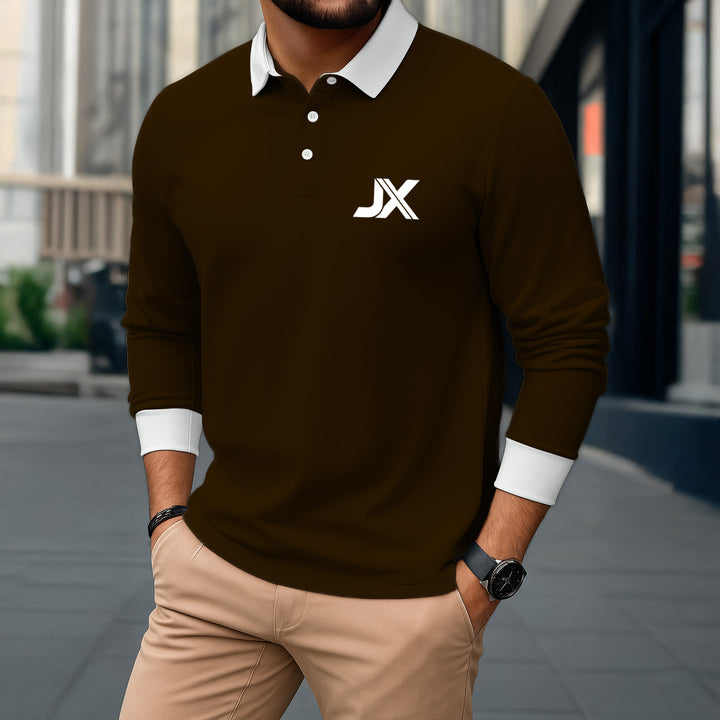 The BROWN FULL SLEEVE POLO NECK T-SHIRT from Juxar stands out for its unique mix of style and comfort. This cotton polo t shirt features a soft pale turquoise color that adds a fresh look to any wardrobe. The black collar and sleeve accents create a classic contrast. This design makes the shirt appropriate for both relaxed and semi-formal settings.